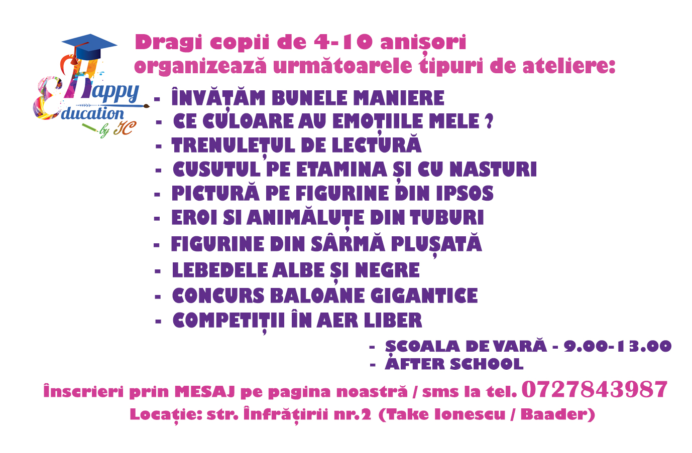 HAPPY EDUCATION by Ioana Covașă invită TOŢI copiii de 4-10 anişori la un program de dezvoltare personală în vacanţă. Organizam ateliere in care invatam BUNELE MANIERE…. în limbajul copiilor… Taxa este de 35 lei/copil/atelier. Un super atelier interactiv pentru copii, plin cu exemple din viata de zi cu zi, aplicatii, jocuri de rol, teatru, glume, proverbe… etc… Fiecare atelier va avea alta tematica saptamanala. Locaţia noastră este pe str. Înfrăţirii nr.2, langă Pompierii /Biserica de pe Baader, în curtea celor 6 case. Nu prea departe nici de Poliţia – caziere, Take Ionescu. Copiii vor fi lăsați singurei la atelier, pentru atingerea scopului acestuia. Înscrierile și rezervarile se fac prin mesaj privat sau sms la 0727843987, pentru a vă putea confirma rezervarea locului. Locurile sunt limitate. Va asteptam cu mareeeeeeeeeee nerabdare!